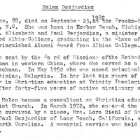 t h e dau ~hte of s . Eli zabe t h a n d Paul De s jardins , a mi nister in the Detroit Con ference. She attended A l bi o ~ C o l le ~e, gra dua ting i n ~ he 0 lass of 1914 . She l at er